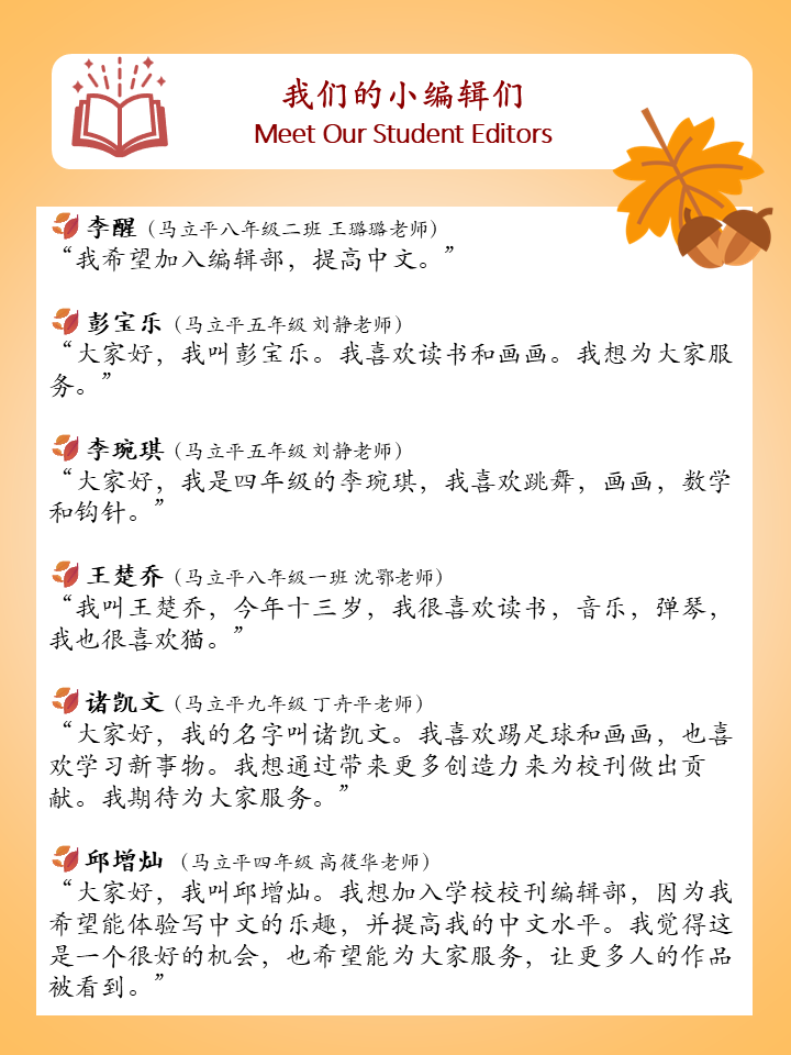 The successful launch of this inaugural issue represents the collective dedication and effort of our teachers, students, parents, and many volunteers. From content planning to editing and design, every step reflects our community’s passion for Chinese language education and cultural heritage.